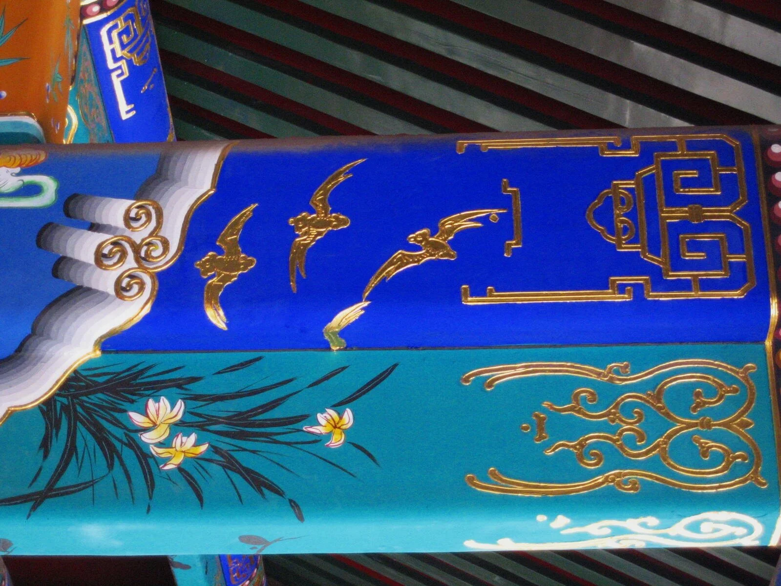 The painted bats on the beams of a traditional Chinese corridor. /在傳統中式走廊橫樑上漆成金色的蝙蝠。